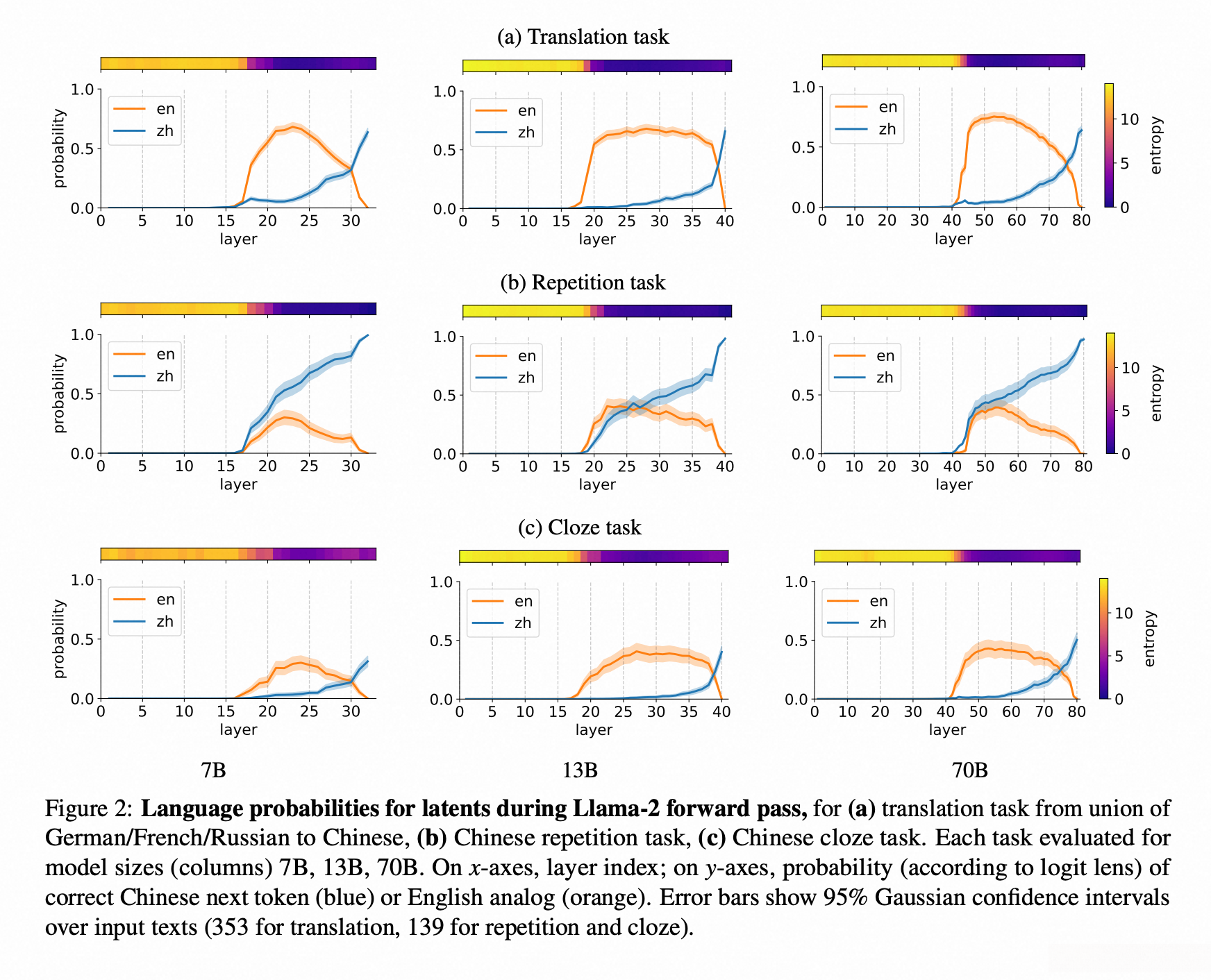 在中间层中,在解码语义上正确的下一个词方面表现优异;然而,在英文译本的概率上却略高于原文。