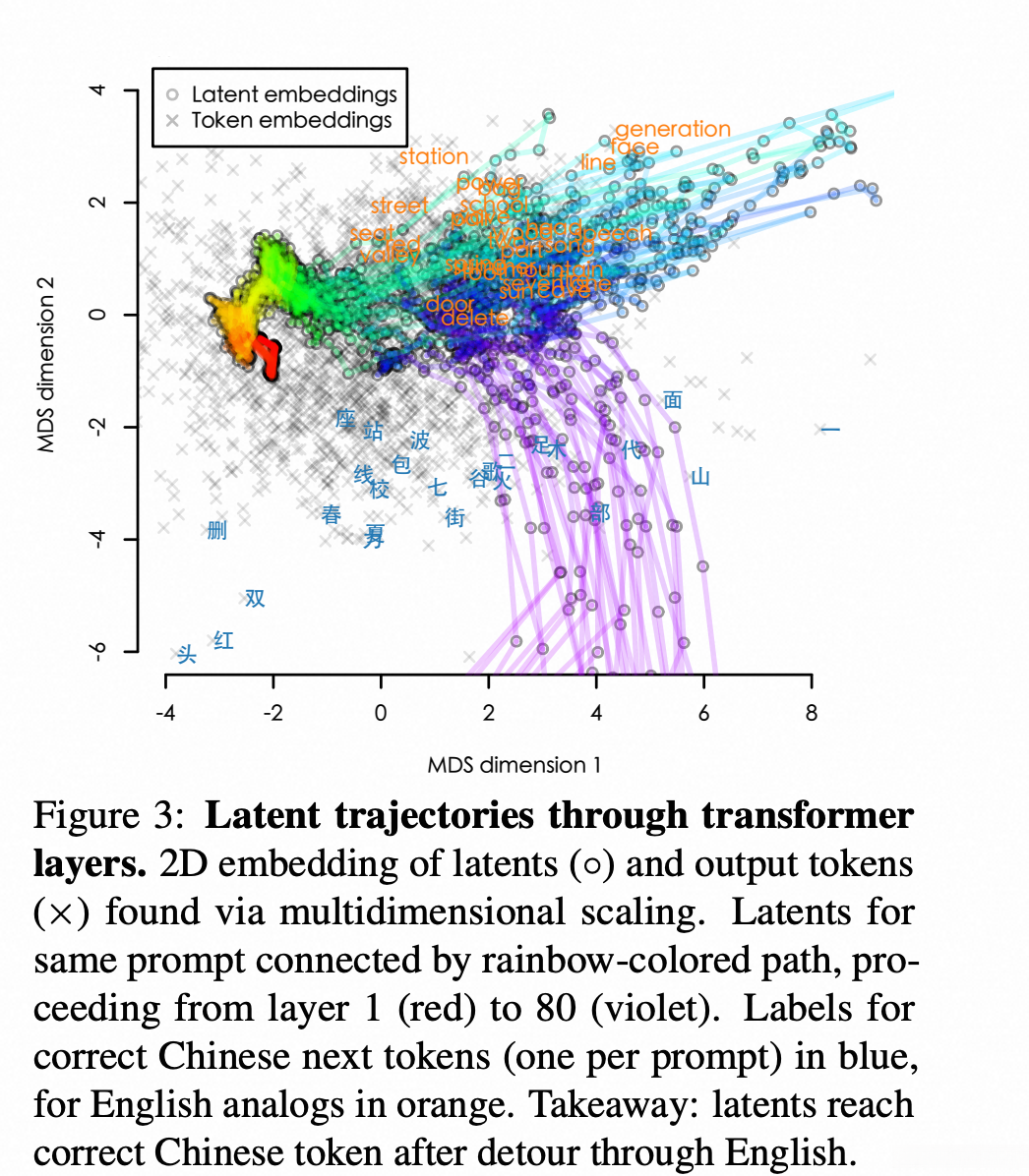 本研究探讨了一个关键问题:即在不平衡且以英语为主导的数据集上进行训练的语言多模态模型是否将英语作为其内部中介语言?这一问题对于深入分析该模型的语言理解和潜在偏见来源而言具有重要意义。本研究的主要关注点在于Llama-2系列中的Transformer架构。在实验中采用了一组独特的非英语提示词序列,并通过逐步分析其嵌入空间的变化轨迹来揭示其生成机制的特点。具体而言,在Transformer网络中各层之间的信息传递过程如下:从输入嵌入到输出嵌入的空间映射关系中逐步提取关键词信息;通过层与层之间的权重转移关系实现对上下文依赖性的建模;最后,在预测结果生成的过程中实现了对目标词语的概率评估。通过对各层特征向量的空间分布进行动态跟踪和可视化分析,在不同处理阶段分别观察到了三种典型的行为模式:初始阶段呈现随机分布状态;中间阶段逐渐呈现出有序排列特征;最终阶段则形成了稳定的向量化表示模式。