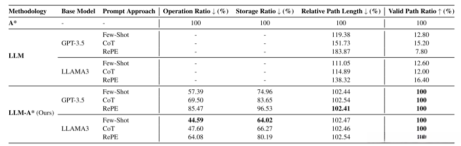研究表明,在与传统A算法相比时,LLM-A显著提升了操作性能和存储效率。具体而言,在采用LLM-A模型时,在操作方面的得分达到了57.39%,而在存储方面的得分则为74.96%。与LLAMA3模型相比,在运算资源消耗上降低了约44.59%,同时减少了64.02%的存储需求,并且路径长度相较于基准有所增长(分别增加了2.44%和2.47%)。这些结果表明,在所有应用场景下均实现了100%的有效路径覆盖率,并且观察到的路径长度相对于最优路径的增长仍然较为有限。值得注意的是,在单独使用LLM-only方法时由于缺乏LLM-A提供的启发式指导或A固有的确定性保证而导致其在路径规划方面表现低于LLM-A和A算法;将LLM技术整合至LLM-A中不仅显著提升了其操作能力和存储效率还使其性能超越了传统A*算法