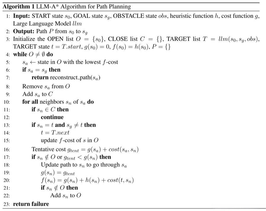 1: Input: START state s0, GOAL state sg, OBSTACLE state obs, heuristic function h, cost function g, Large Language Model llm