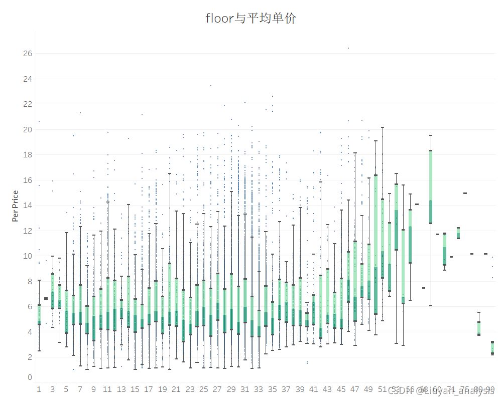 2.面积变化,单价波动明显,说明面积对单价有一定影响。