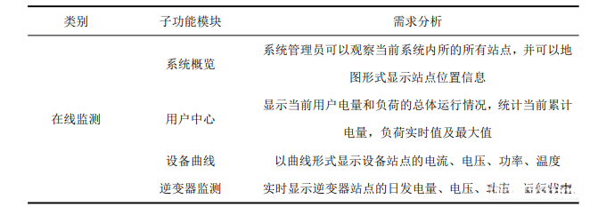 (1) 在线监测。主要包括系统概览、用户中心、设备曲线及逆变器实时监测,需完 成对光伏各设备电参数的采集,包括:电压、电流、功率、温度和频率等,并进行实时 监测,各功能具体需求分析如表所示。