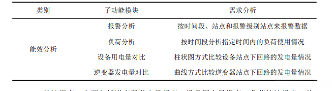 (2) 能效分析。主要包括:报警分析、负荷分析、设备用电量对比、逆变器发电量 对比,数据进行可视化呈现,其各功能具体需求分析如表所示。