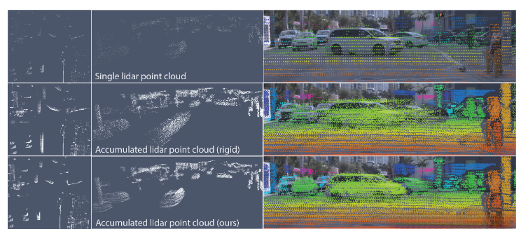 场景流集成的例子,以密实Argoverse激光雷达点云。左边的列和中间的列分别是点云的顶部视图和正面视图。最右边的一列显示了投影到图像上的累积点云。注意,当严格累积点云(中间行)时,动态对象上的涂抹效果。使用我们的神经先验进行积累,很好地产生了更密集的点云,同时照顾到场景中的所有动态对象。这里,刚性意味着使用刚性配准方法(即ICP)进行点云积累,其中使用刚性6自由度姿态进行配准。