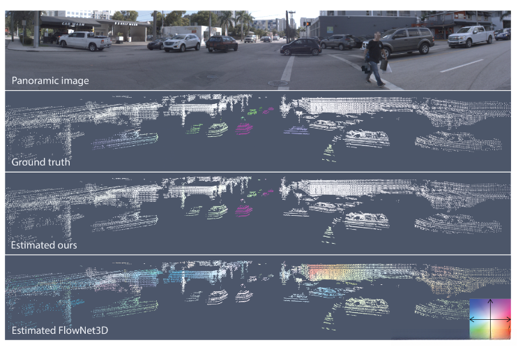 使用所提出方法的场景流估计的定性示例。复杂且高度动态的驾驶场景来自Argoverse场景流数据集。该方法估计的场景流接近于真实的场景流。用在FlyingThings3D上训练并在KITTI场景流数据集上微调的有监督FlowNet3D方法进行了预测。请注意,当对分布外样本进行推理时,场景流如何偏离真实情况。场景流颜色编码流向量的大小(颜色强度)和方向(角度)。例如,紫色的车辆正朝着东北方向行驶。