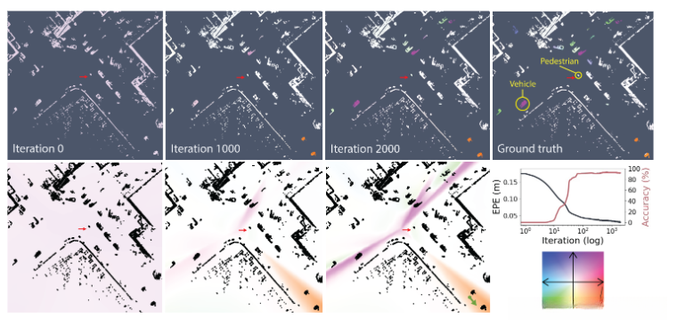 示例显示了估计的场景流和由神经先验给出的连续流场(底部)如何随着优化收敛到一个解决方案而变化。展示了Argoverse场景流中的俯视图动态驾驶场景。场景流颜色编码流向量的大小(颜色强度)和方向(角度)。例如,紫色的车辆正朝着东北方向行驶。红色箭头表示自动驾驶车辆行驶的位置和方向,它会停下来,等待行人过马路。请注意,在迭代2k时,预测的场景流与真实值非常接近。在迭代0时,给定神经先验的随机初始化,场景流是随机的。因此随机方向的数量级非常小。随着优化的进行,流场得到了更好的约束。解释流场的一种简单方法是想象在连续场景流场的任何位置采样一点,以恢复估计的流矢量。例如,假设在迭代2k时(右下角的绿色箭头)对流场中橙色区域周围采样一个点。流矢量的方向将以特定的幅度指向东南,类似于橙色区域中的车辆。