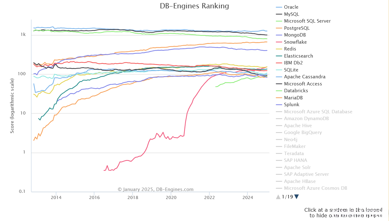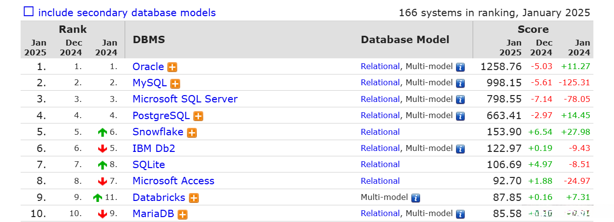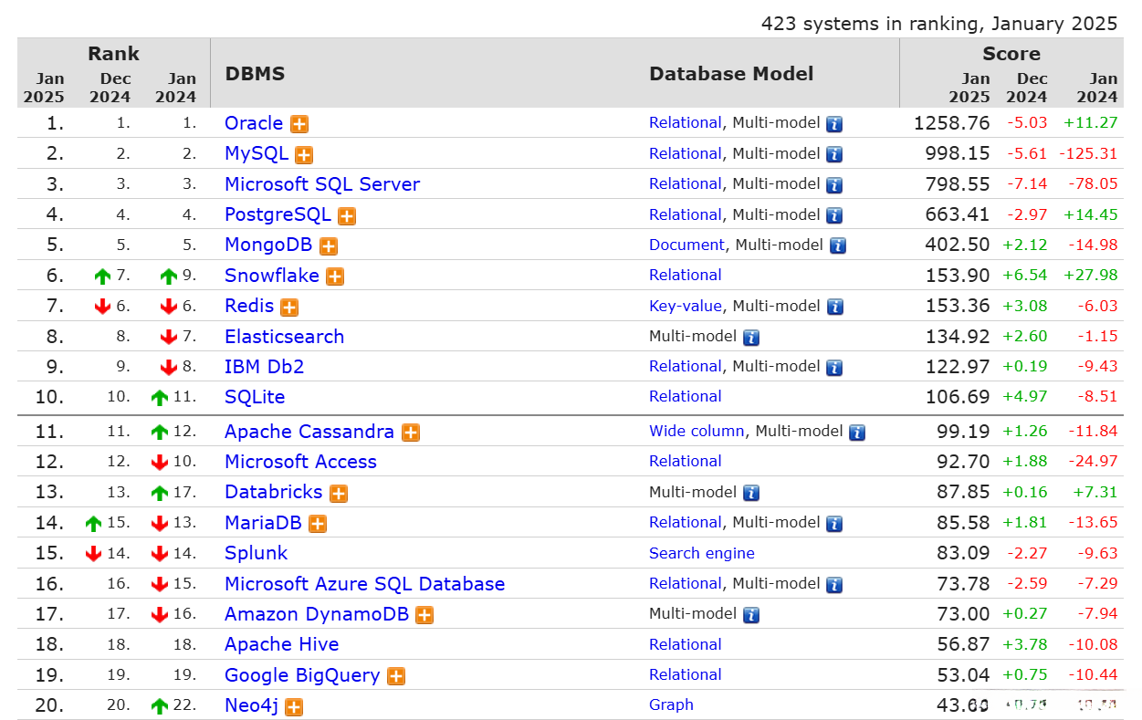 Oracle 连续三个月占据首位,在最新排行榜中表现稳定。数据显示其2025年1月得分较上个月增长5.03分(较去年同期提升11.27%),呈现持续上升趋势。作为老牌强企,在企业级应用领域具有显著优势(其性能指标遥遥领先于竞争对手)。近期其排名稳步提升。
