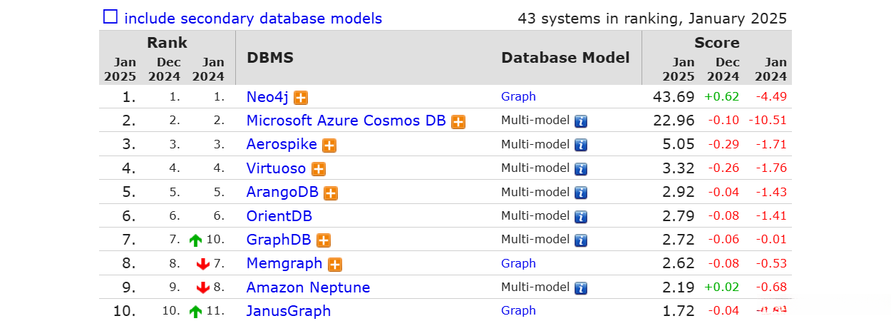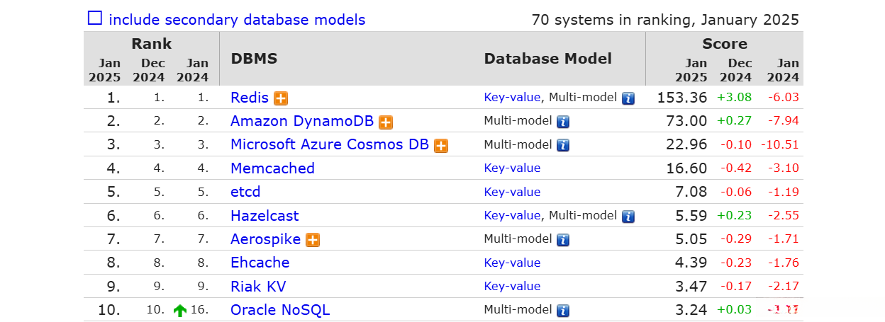 Redis 的排名在最新数据中略有下滑至第七位,并且近期经历了两次降级调整:一次是从第六位降级到第七位;另一次则是从第六位直接降级到第七位的一次性调整。