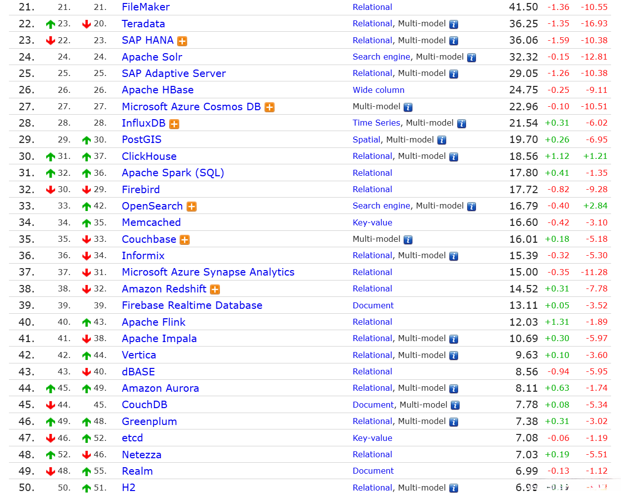 Snowflake 在最新排行榜中首次跃升至第六位,并且显示出强劲的增长势头:其与上个月相比增长了6.54分(而去年同期则下降了27.98分)。作为云原生数据仓库解决方案的代表,在云计算时代展现出巨大的发展潜力。