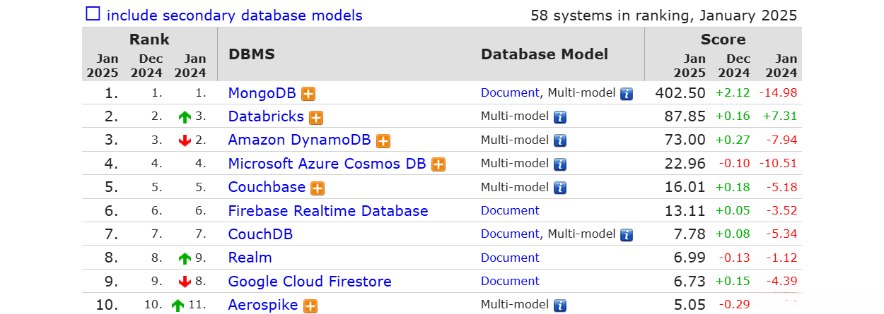MongoDB 近期持续位列第五名,在最新排行榜中得分较上个月有所提升(增长率为2.12%)。然而与去年同期相比仍出现了明显的下降趋势(降幅为14.98%)。