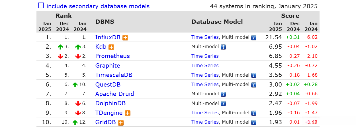 DB-Engines Ranking是基于当下关注度对数据库管理系统进行排序的列表。可依据以下指标进行评估: