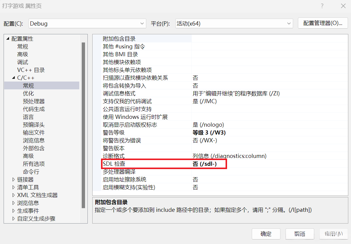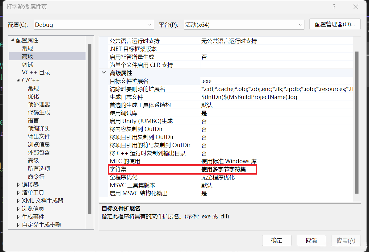 必须确保字符集设置与我的配置一致以便正常运行代码。将导航栏属性中的高级选项中的字符集字段更改为多字节编码,并将编程语言从c/c++更改为SDL库。