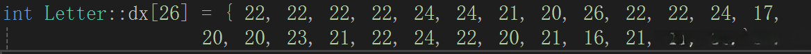 int Letter::dx[26] = { 22, 22, 22, 22, 24, 24, 21, 20, 26, 22, 22, 24, 17,