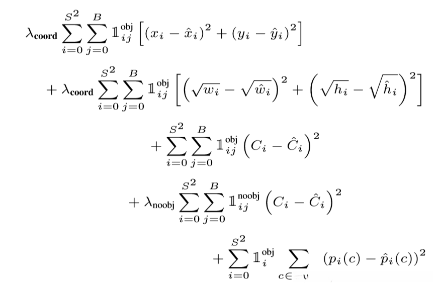 在损失函数方面,YOLO采用平方误差的形式作为其核心机制。论文指出这种设计易于优化的原因在于其简便性。然而,在每个图像中,许多网格单元并未包含任何目标物体。这些未包含目标的单元格通常会被赋予接近于零的置信度分数,并且这一设定会压倒包含目标单元格所具有的显著梯度值。这种做法可能导致模型出现不稳定现象,在训练初期可能导致发散问题。此外,在处理大小不同的边界框时给予相同的权重也是平方误差的一个特点。而我们的期望是较大的边界框与较小框之间的误差差异更显著地被模型捕捉到。