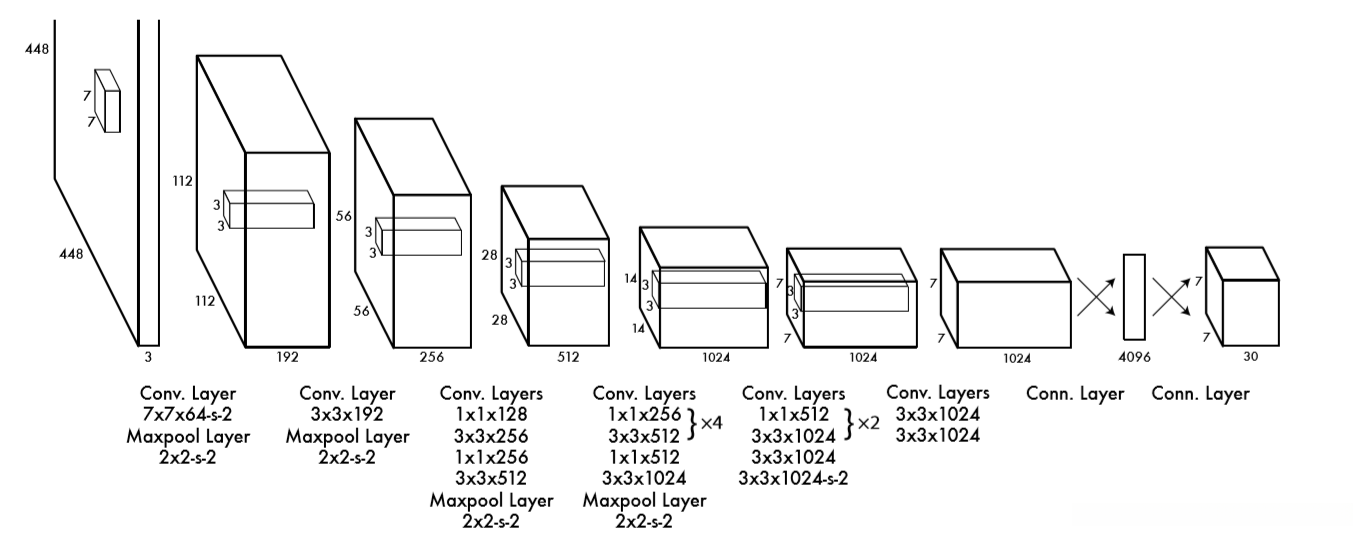 该检测网络包括24个卷积层以及两个全连接层。在各相邻的卷积层之间交替插入了1×1尺寸的卷积核以减少前一层的空间维度。其中,在ImageNet分类任务中输入图像像素大小为(224×224),而在目标检测任务中则采用(448×448)的像素尺寸。值得注意的是,在经过全部(即第)25个卷积后采用了平均池化操作作为最终池化手段;而所有其他中间各层层均采用了带有泄漏率ReLU(Leaky ReLU)的激活函数。据称该研究者表示完成整个网络训练过程所需时间长达一周;此外论文进一步提出了一种加速YOLO算法的具体框架方案仅使用了9个卷积核以及相应数量滤波器数量减少了相应的计算量但并未改变其基本架构。