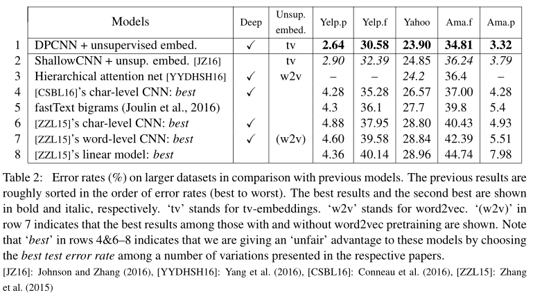 此外, 作者为了进一步提升性能, 采用了tv-embedding (two-views embedding)这一技术, 从而进一步提升了DPCNN的准确性. 这主要是由于引入了预训练的词向量模型.