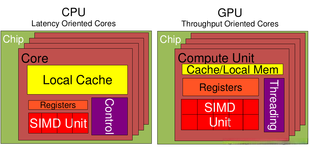 SIMD Unit(单指令多数据流,以同步方式,在同一时间内执行同一条指令): GPU > CPU。