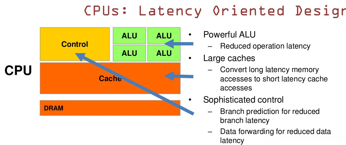 CPU虽然有多核,但总数没有超过两位数,每个核都有足够大的缓存和足够多的数字和逻辑运算单元,并辅助有很多加速分支判断甚至更复杂的逻辑判断的硬件;CPU擅长处理具有复杂计算步骤和复杂数据依赖的计算任务。CPU需要很强的通用性来处理各种不同的数据类型,同时又要逻辑判断又会引入大量的分支跳转和中断的处理。这些都使得CPU的内部结构异常复杂。
