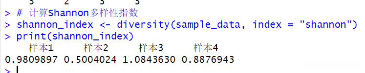 该指数通过综合考量物种丰富度与物种相对丰度的变化趋势而实现生态系统的生物多样性的量化评估。在R编程语言环境中,默认情况下提供了计算Shannon生物多样性指数所需的核心函数,并且该公式通过整合物种数量与其相对频率的变化关系来评估生态系统中的生物多样性水平。