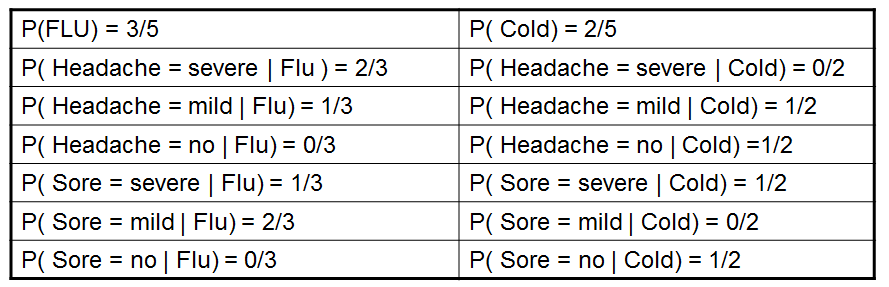 P( Flu| Headache = severe, Sore = no,Temperature = normal, Cough = yes)