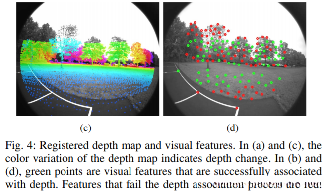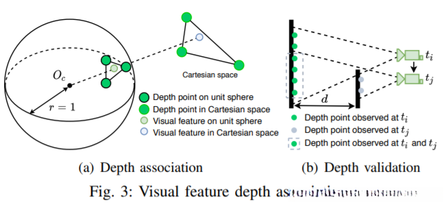 我们通过评估特征点最近三个连续深度点的距离来验证关联特征深度。叠加来自不同时间戳的激光雷达帧可能会导致不同对象出现深度模糊问题。具体示意图见图3(b)。在时间t_i时观察到的各处深度数据均以绿色标注。相机在t_j时刻移动后观测到了更多的灰度区域。而在t_i时观测到的部分被灰色框选中的区域可能仍然可见于t_j时刻的空间位置中。因此使用来自不同对象的多个深度值来进行关联会导致估算结果出现偏差。与该领域的研究论文——Laser-Visual-Inertial Odometry and Mapping with High Robustness and Low Drift——的做法一致,在计算各特征周围各测量区域的最大间距时发现其超出2米的情形则不会进行数据关联处理