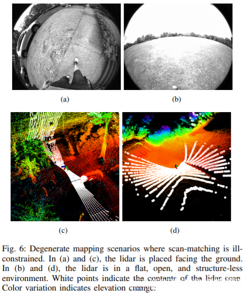 2)失败检测:虽然激光雷达能够获取场景中较远范围内的详细信息,但会在某些情况下导致扫描匹配失败(如图6所示)。我们采用了On Degeneracy of Optimization-based State Estimation Problems论文中所述的方法来判断LIS系统是否出现了故障。