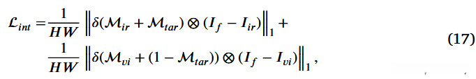 另一方面,遵循 STDFusionNet [12],我们采用显着目标掩模 tar 来指导融合网络保留红外图像中的重要目标。具体来说,很容易从语义分割标签生成显着目标掩模。因此,强度损失int可以表示为: