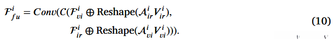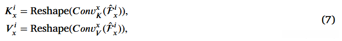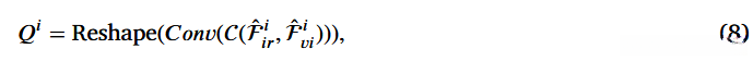 其中 x ∈ {ir, vi} 表示模态,Ki x ∈ RHiWi×Ci 表示键,V i x ∈ RHiWi×Ci 表示值。 Conv(⋅) 和 Reshape(⋅) 分别对应于内核大小为 3 × 3 的卷积层和重塑操作。 Hi、Wi 和 Ci 分别指输入特征 ̂ i x 的高、宽和通道。应该注意的是,红外和可见光特征都被合并来生成我们的模态不变查询,如方程式所示。 (8),这使我们能够完全利用多模态特征中的互补特性: