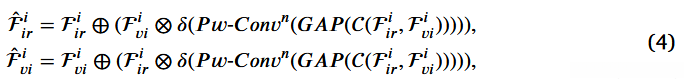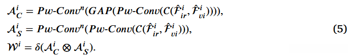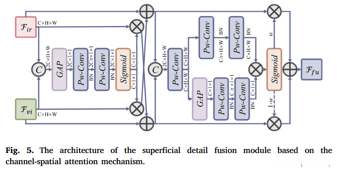 其中⊕表示逐点求和,⊗表示逐点乘法,P w-Convn(⋅) 表示n个级联的逐点卷积层,(⋅)表示通道维度上的级联操作,δ(⋅)和GAP (·) 分别表示 sigmoid 函数和全局平均池化。然后,增强的特征在通道维度上串联起来,并输入到并行通道注意力和空间注意力模块中,以生成最终的融合权重。融合权重生成过程可以表述为: