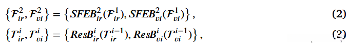 其中i = 3,4,5,6,ResB表示ResNet中的残差块。特别地,当i = 1,2,3时, i ir 和 i vi 分别代表表面红外和可见光特征。若i = 4, 5, 6,则 i ir 和 i vi 分别表示深层红外语义特征和可见语义特征。相应地,我们开发了浅层细节融合模块和深层语义融合模块,分别聚合浅层和深层特征中的互补信息。