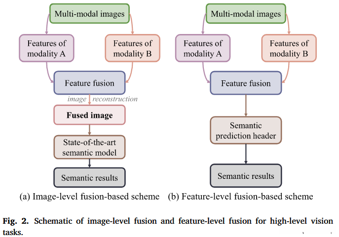 近年来,Transformer [23] 在高级 [46-49] 和低级 [50-52] 视觉任务中都表现出了超越 CNN 的巨大潜力。因此,开发了一些基于transformer的融合模型,如SwinFusion[15]、IFT[53]和AFT[54],以充分探索源图像中的远程依赖关系。考虑到红外和可见光图像在实际应用中通常存在不同程度的不对准,最新的方法(如RFNet[55]、UMF-CMGR[40]、ReCoNet[42]和SuperFusion[41])在融合模块之前加入对准模块,以在源图像中配准不对准。此外,一些方法,包括 PMGI [56]、IFCNN [57]、U2Fusion [58]、DeFusion [59] 和 SwinFusion [3] 对各种图像融合任务进行统一建模,因为这些任务之间存在共性。特别是,U2Fusion为多个融合任务训练了一个统一的模型,促进了不同融合任务之间的交叉融合。然而,上述所有方法主要集中于整合源图像中的补充信息并增强融合图像的视觉吸引力。他们都没有考虑后续高级视觉任务对融合结果的要求。