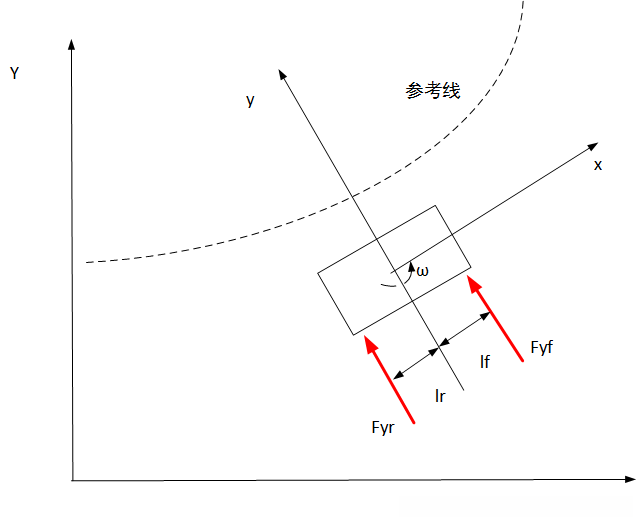 如上图所示,车辆的y方向受到前后轮胎的摩擦力,同时绕着中心轴做旋转运动,以此根据y方向上的力平衡,以及绕中心轴的力矩平衡,可以得到