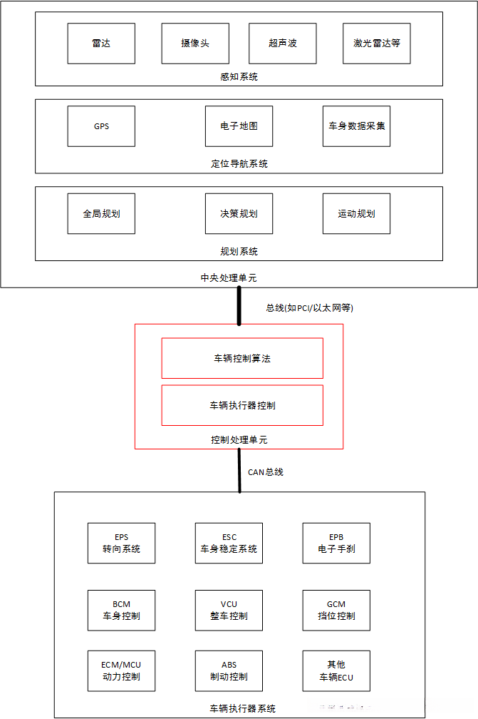 如图所示,为一种典型的自动驾驶控制系统,包括感知-定位-规划-控制以及车辆执行器,车辆控制则直接通过CAN与车辆通信,进行对车辆执行器的控制。