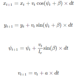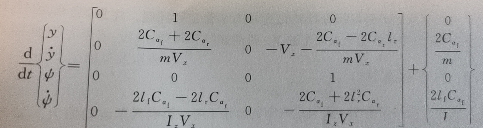- m*ay = Fyf + Fyr (其中ay = y'' + Vx *ψ')