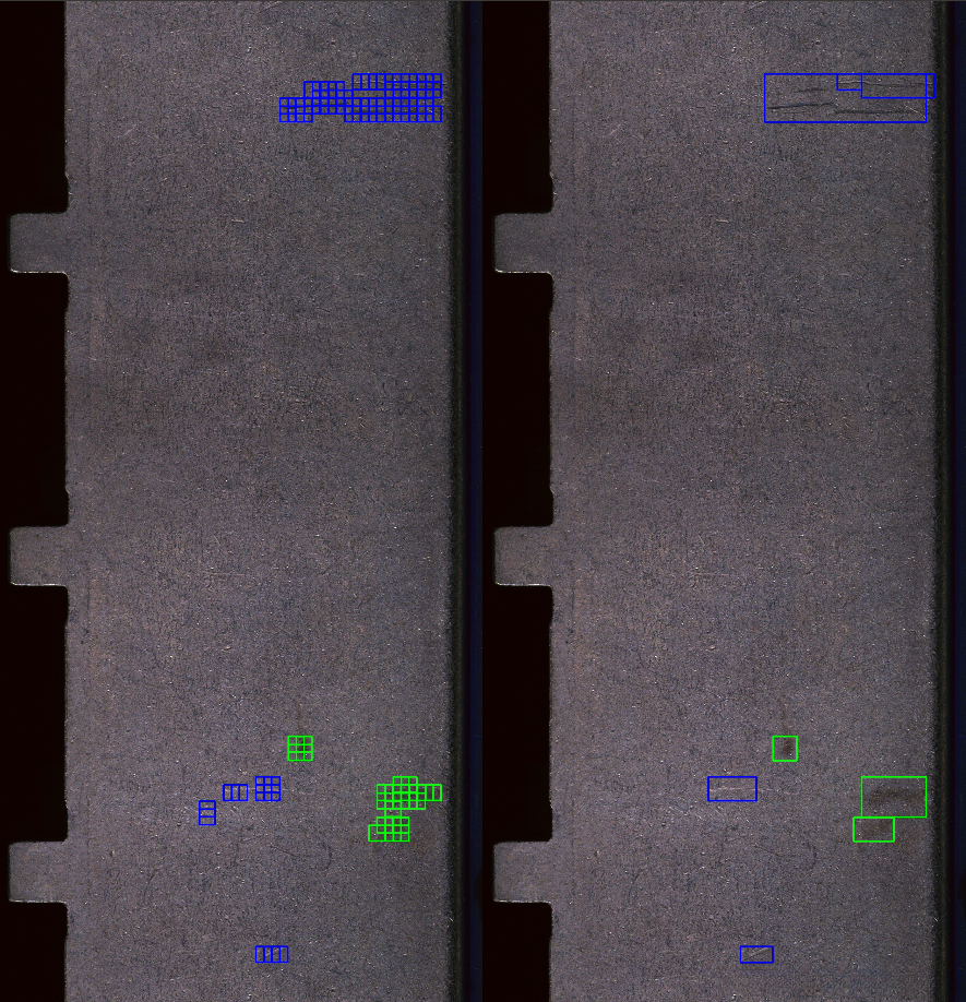 总计标注200余张样本,覆盖各种类型的缺陷。在2000余张不参与训练的样本测试,明显缺陷检出率100%,误检率0.1%(大多比较小)。效果如下: