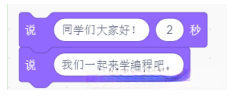 请同学们大家开始! "一起学习编程的过程"这两句话各显示2秒钟的问题框。
