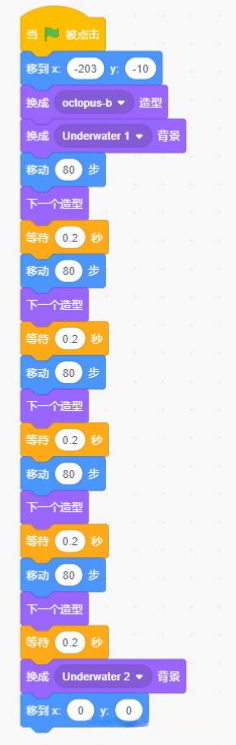 (3) 章鱼到达舞台最右边后, 切换为 Underwater2, 章鱼移到舞台中心位置;