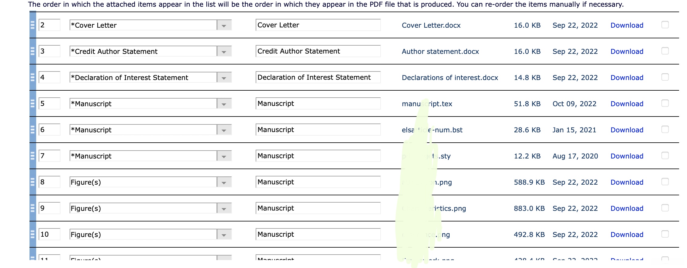 在投稿时,在使用LaTeX编辑器时,请确保上传的文件包括tex文件以及bst、sty、bib、bbl、cls(据说可选不传)。这些文件都应归类于Manuscript标签中,并在其描述信息中明确标记为Manuscript。此外,请确认图片属于Figure(s)标签,并在其描述信息中同样标记为Manuscript以避免混淆。编辑完成后即可正常生成PDF版本的文档