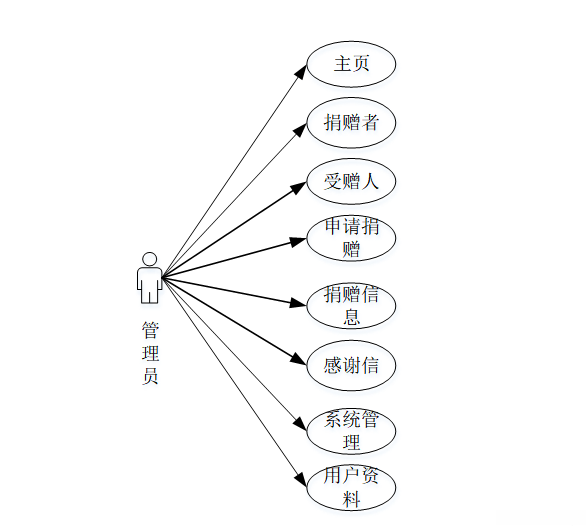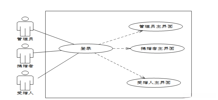 系统的核心功能模块涵盖捐赠者登录系统和密码修改界面等关键组件,在多个业务流程中发挥着不可或缺的作用。这些功能由不同角色共同依赖的重要组成部分,并通过详细的用例分析(如图4-1所示)得以验证其可行性与可靠性