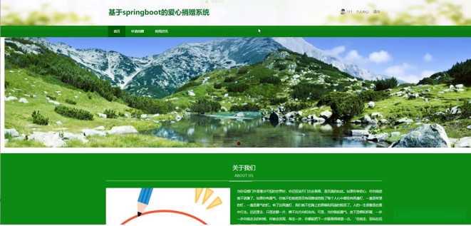 当捐赠者打开系统的网址后时, 最初映入眼帘的是首页界面. 在这里, 捐赠者可以看到爱心捐赠系统的导航栏呈现首页. 申请捐赠. 新闻资讯及个人中心等, 如图5-1所示.