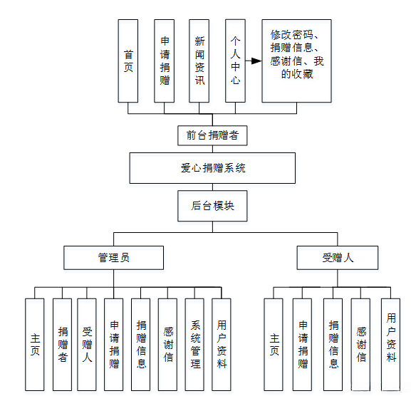 本系统基于自顶向下的架构进行软件开发与功能实现过程,并旨在构建一个涵盖爱心捐赠的完整管理平台;该平台主要包含管理员功能模块、受赠人管理模块以及捐赠者信息录入模块等核心组件。