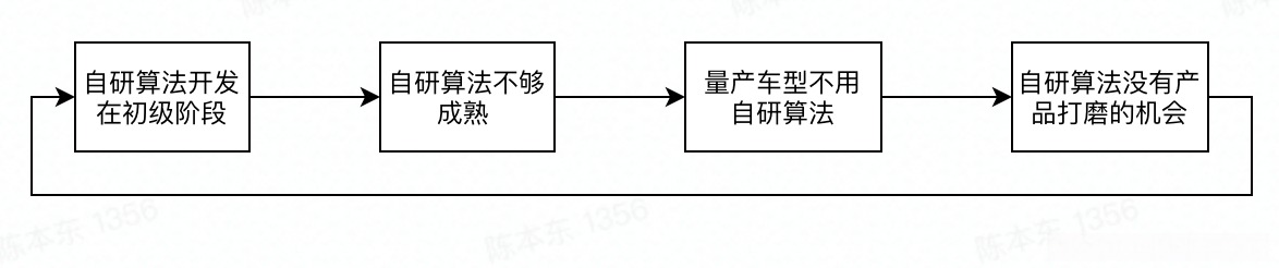 而是因为恶性循环:因为自研算法不成熟,所以量产车型不用,所以自研算法没有成熟机会,循环往复。