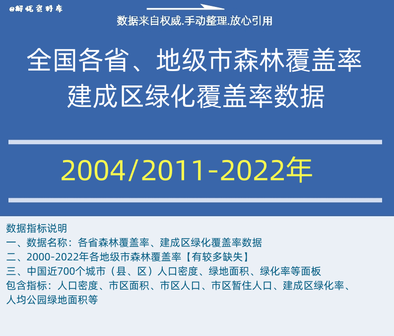 包含了2000-2022年288个地市单位森林覆盖率数据,2022年有效数据量为158地区