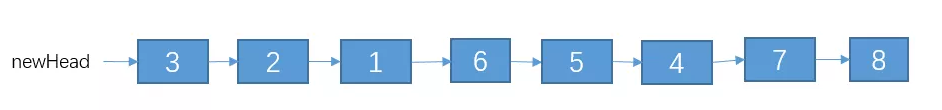该链表可以看作是原问题的一个子问题。通过调用reverseKNode()方法可以实现对该链表中每K个节点之间的逆序处理。接着使用reverse()方法对该部分三个节点进行逆序处理。