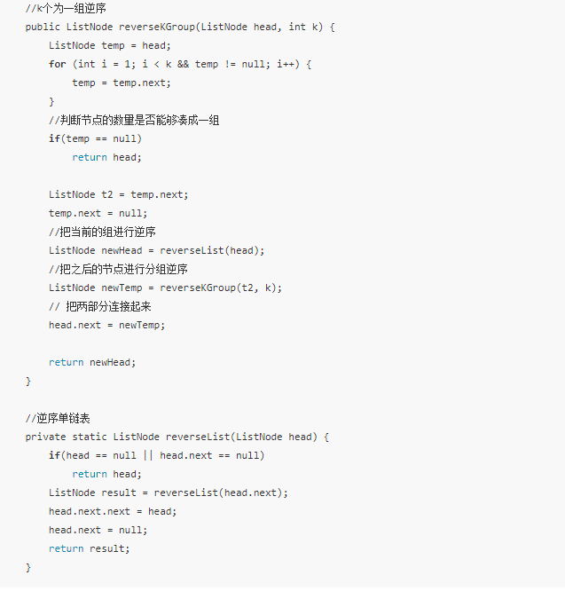 这道题我们可以采用递归方法来解决;假设method reverseKNode()的作用是对单链表每隔K个节点进行逆序排列(从开头开始分组哦); reverse()函数的作用是对单链表进行逆序排列。