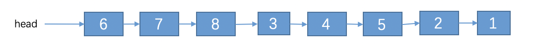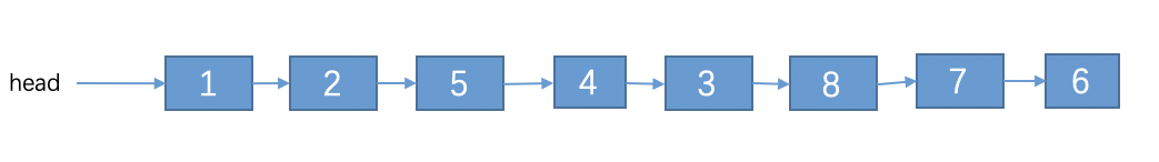 链表:1- >2->3->4->5->6->7->8->null, K = 3。那么 6->7->8,3->4->5,1->2各位一组。调整后:1->2->5->4->3->8->7->6->null。其中 1,2不调整,因为不够一组。