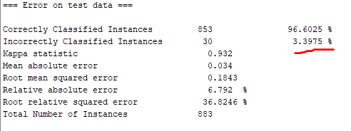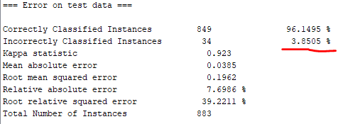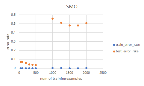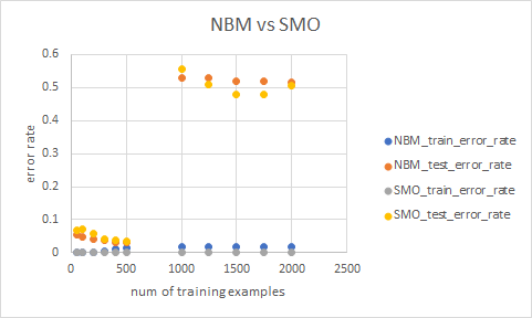 1)针对训练数据进行分类测试时,在采用NBM与SMO算法的情况下均能实现较低程度上的误分率;其中SMO的表现更为出色,并且这种差异性随着训练数据量的增长而愈发显著;