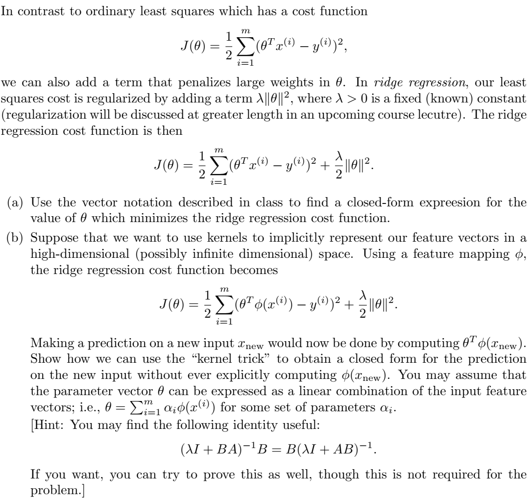 如果把x^{(i)}替换成\phi(x^{(i)}),则\theta=(\phi(X)^T\phi(X)+\lambda I)^{-1}\phi(X)^T\vec y