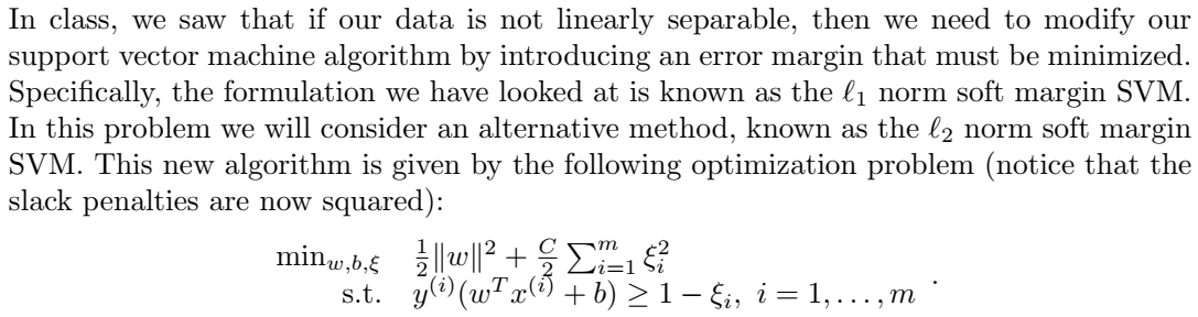 \begin{aligned} \mathcal{L}(\omega,b,\xi,\alpha,\gamma)=&\frac{1}{2}\omega^T\omega+\frac{C}{2}\sum^m_{i=1}\xi^2_i-\sum^m_{i=1}\alpha_i[y^{(i)}(\omega^Tx^{(i)}+b)-1+\xi_i]\\ =&\frac{1}{2}\sum^m_{i=1}\alpha_iy^{(i)}(x^{(i)})^T\sum^m_{j=1}\alpha_jy^{(j)}x^{(j)}+\frac{C}{2}·\frac{1}{C^2}\sum^m_{i=1}\alpha_i^2-\sum^m_{i=1}\alpha_i[y^{(i)}(\omega^Tx^{(i)}+b)-1+\frac{\alpha_i}{C}]\\ =&\frac{1}{2}\sum^m_{i=1}\alpha_iy^{(i)}(x^{(i)})^T\sum^m_{j=1}\alpha_jy^{(j)}x^{(j)}+\frac{C}{2}·\frac{1}{C^2}\sum^m_{i=1}\alpha_i^2-\sum^m_{i=1}\alpha_iy^{(i)}(\omega^Tx^{(i)}+b)+\sum^m_{i=1}\alpha_i-\frac{1}{C}\sum^m_{i=1}\alpha_i^2\\ =&\frac{1}{2}\sum^m_{i=1}\alpha_iy^{(i)}(x^{(i)})^T\sum^m_{j=1}\alpha_jy^{(j)}x^{(j)}+\frac{C}{2}·\frac{1}{C^2}\sum^m_{i=1}\alpha_i^2-\sum^m_{i=1}\alpha_iy^{(i)}\omega^Tx^{(i)}-\sum^m_{i=1}\alpha_iy^{(i)}b+\sum^m_{i=1}\alpha_i-\frac{1}{C}\sum^m_{i=1}\alpha_i^2\\ =&\frac{1}{2}\sum^m_{i=1}\alpha_iy^{(i)}(x^{(i)})^T\sum^m_{j=1}\alpha_jy^{(j)}x^{(j)}-\sum^m_{i=1}\alpha_iy^{(i)}\sum^m_{j=1}\alpha_jy^{(j)}(x^{(j)})^Tx^{(i)}+\sum^m_{i=1}\alpha_i-\frac{1}{2C}\sum^m_{i=1}\alpha_i^2\\ =&-\frac{1}{2}\sum^m_{i=1}\alpha_iy^{(i)}(x^{(i)})^T\sum^m_{j=1}\alpha_jy^{(j)}x^{(j)}+\sum^m_{i=1}\alpha_i-\frac{1}{2C}\sum^m_{i=1}\alpha_i^2\\ =&\sum^m_{i=1}\alpha_i-\frac{1}{2C}\sum^m_{i=1}\alpha_i^2-\frac{1}{2}\sum^m_{i,j=1}y^{(i)}y^{(j)}\alpha_i\alpha_j(x^{(i)})^Tx^{(j)}\\ =&\sum^m_{i=1}\alpha_i-\frac{1}{2C}\sum^m_{i=1}\alpha_i^2-\frac{1}{2}\sum^m_{i,j=1}y^{(i)}y^{(j)}\alpha_i\alpha_j\\ \end{aligned}