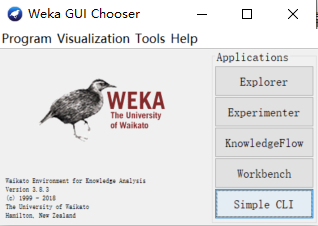 在 Windows 系统中打开 WEKA 软件,并选择‘Simple CLI’模块即可启动‘SimpleCLI’窗口。